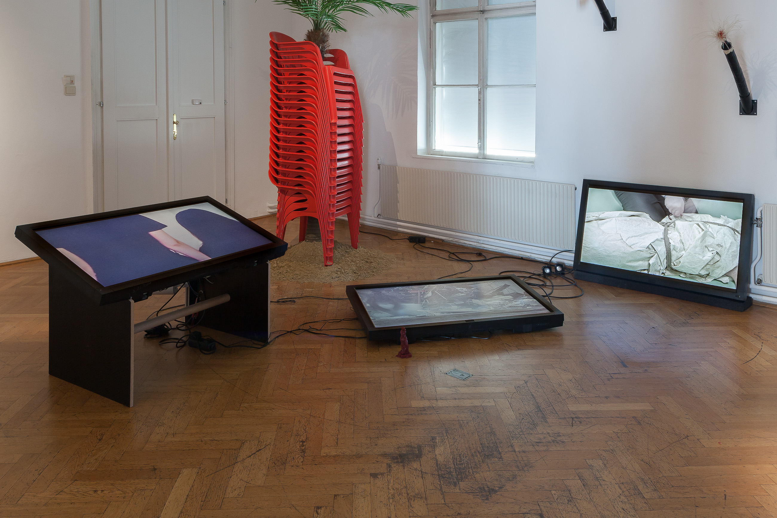 Dorian Sari, in their video work, A&a (If art fails, thought fails, justice fails) (2019), unveils a fight between two people opposed by dissimilar forces. While their nudity and bodily engagement create a certain eroticism, what we see is an inequality, oppression, and tyrannical torture that echoes social and racial realities. İz Öztat, in the video work Suspended (2019) made in collaboration with Ann Antidote, equates the suspension of freedom with becoming a body without willpower. Zeynep Kayan, in her video one one two, one two three: chair (2021), presents a scene where we see a figure that was pushed, pressed, and cornered against the wall by another silhouette as if one is chased by its shadow. Toni Schmale’s sculpture merges rigid, brutal, and industrial with sensual, libidinal, and unique; crystallizes the dialogue between sex and violence in the form of an oversized buttplug. Can Küçük in his sculpture, Centuries (2020), showcases a singularized subway handle as an orthopedic device for a body trying to stand in balance. In his Son (2020), Küçük creates knee pads, pink cushiony materials that are devised to protect the body from potential falls. Natalia Gurova showcases a sculptural silicon assemblage with a table, reproductions of Venus of Milo, and an artistic intervention to a statue from the Volkskunenmuseum collection. Venus, as one of the most copied forms of female beauty in Europe, becomes figurines in silicone that are bruised, still missing both arms, and barely standing upright. The table with a human arm hanging invitingly and pointing to the missing arms of Venus looks at the relationship between the body and the furniture. Artist also repairs the missing hands of the beggar figure from the 18th century which was borrowed from the folklore museum’s profane collection. The artist's intervention of attaching two silicon hands on top of show glass empowers the amputated beggar, suggesting a revision to the societal discipline of the precarious subject.