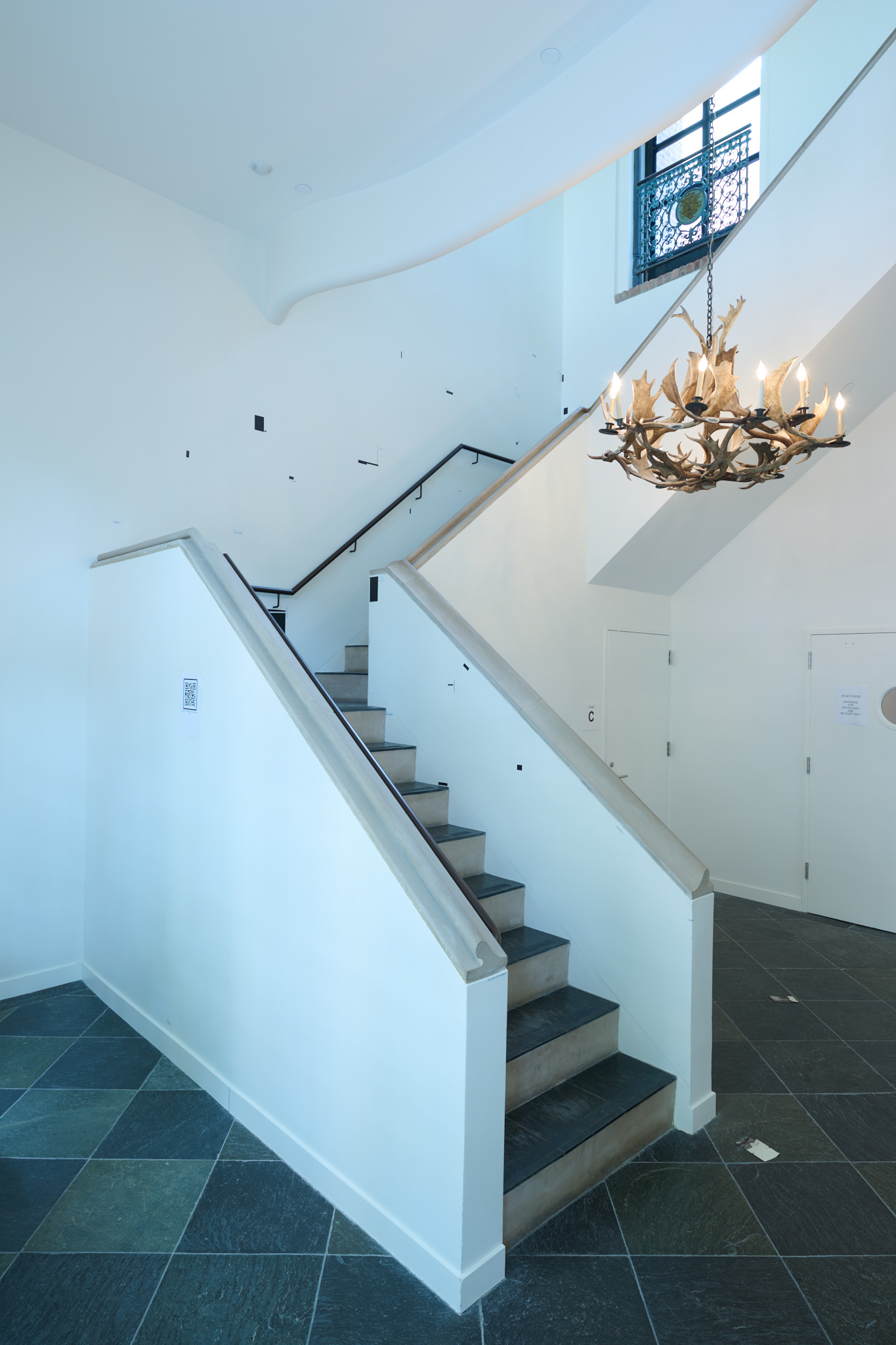 ,they feed on the altitude of our afterlife. combines hand-drawn mathematical notation, a poem obscured using Photoshop’s content-aware function, and scans of Xeroxes. Arranged along the staircase, In combination with this larger vinyl work, small vinyl pieces of text have escaped the frame or spilled out of the confines of a sentence. This work considers the questions posed by Fred Moten in conversation with Renee Gladman’s work in the text One Long Black Sentence:
